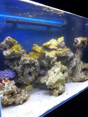 Witam wszystkich i znów serdecznie proszę o pomoc. Po kuracji protomorem od 12 do 17.04 (powód: http://aqua-reef.pl/topic/11515-czy-to-jest-w%C5%82a%C5%9Bnie-orz%C4%99sek-cryptocaryon-irritans/ ) zauważyłem rozrost glonów z dnia na dzień. Dziś po przeszło tygodniu szybę jak tylko wyczyszczę z zielonego nalotu ( nie będę się wygłupiał z nazwami - narazie jestem słaby w dino,cyjano sprawach) praktycznie po 5 min znów jest lekko obsadzona, a po 2h już wydaje się że akwarium jest mętne (warstwa glonów na szybie). Nie to jest jednak moim głównym zmartwieniem-glony których wrzucam zdjęcia rozrastają się - gęste brązowe i włókniste. Moje pytanie brzmi: takie sprawy odsysa się czy one po prostu indikują jakiś problem w baniaku? lub też może mam czekać aż zanikną? Nie wiem czy ma to wpływ ale jako dodatkową informację dodam że wczoraj musiałem odławiać po 2 dobach od wpuszczenia dimidiatus'a (doktorka)-sklep poradził, że ze względu na ospę jest to jakiś oręż na przyszłość - przeprowadziłem aklimatyzację przez 3h, jadł, był aktywny... Informacje: xenia pulsująca 2xczyszcząca 2xturbo 1xstrombus 1x kopiąca rozgw. 2xocellaris mrożonka 2x 1/4kostki, 1xpłatki z dodatkiem czosnku sól aqua reef reef salt mg:1350,ca:455,KH:7.7,NO3:2.5,PO4:0-0.03