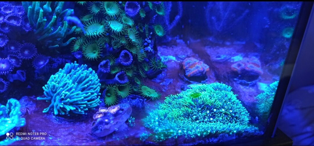 Dużą lipa się pojawiła, zaprzestalem karmić "cudami" Pół kostki mrożonki aktualnie co 2 dni, podmiany 1x/tydz 10%, bakterii nie leje przy tym idzie sama mrozonka. Cyrkulacją wieje idealnie, cały zbiornik faluje, woda krystalicznie czysta, korale napompowane jak nigdy, ale mega DUŻO Cyjano. Pomóżcie, bo taka ilość w takiej kosteczce wszystko mi udusi . Dodam, że wieczorem przy samym niebieskim cyjano nie ma wogole, piasek bielutki..