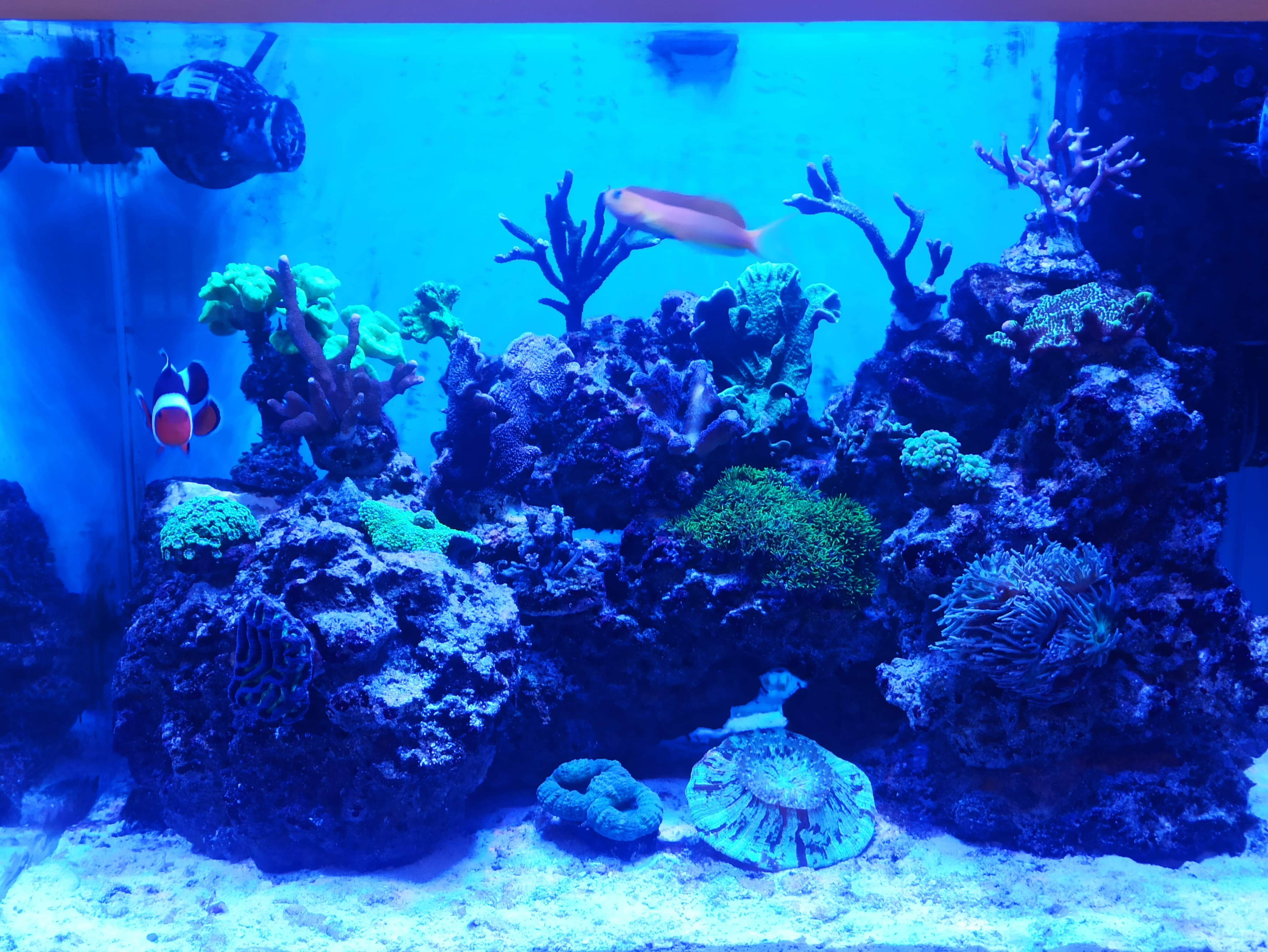 Skała była pokryta dino na koralach się już też pojawiała, szyba tylnia to samo, co moglem to wyszorowałem i odessałem światło białe zmiejszone o połowę bakterie x2 i nie robię podmianki w tym tygodniu.