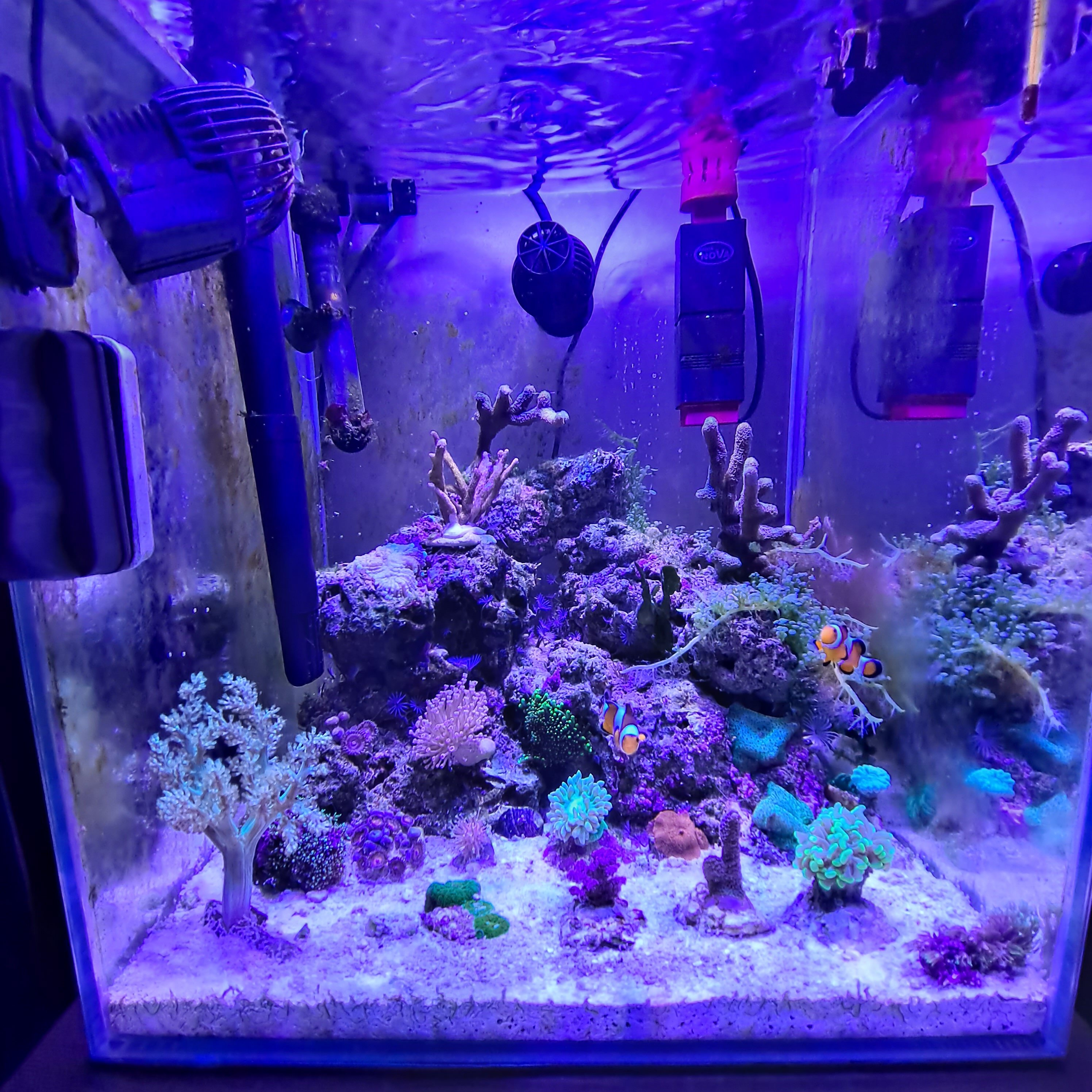 Witam.Piętnaście tygodni od zalania mojej małej rafki.Parametry wody Kh-8,1 NO3-0,PO4-0,Ca-450,Mg-1300,sól-1,025.Koralowce wydają się zadowolone,rybki i krewetki również.Poza seriatoporą która z nie wyjaśnionych przyczyn odeszła na wieczną rafę,nie ma żadnych strat.Jej miejsce zajęła mała pocilopora różowa.Karmienie mrożonki,plus 20ml fito dziennie,suplementacja delikatna preparatami seachem reef carbonate,reef complete,reef plus.Oprócz nalotów na szybach,żadnych niepokojących oznak dino czy cyjano nie widać.Oby tak dalej.