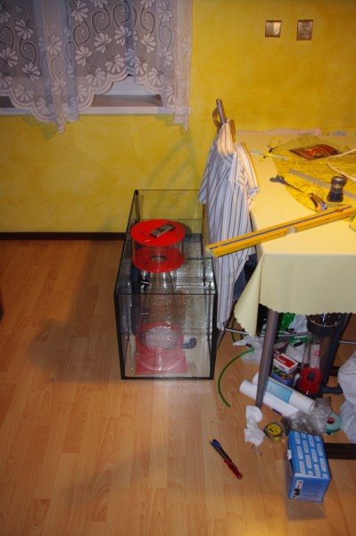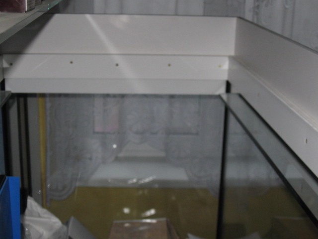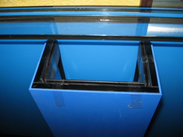 Zbiornik ma stanąć na holu (połączony aneks kuchenny z jadalnią) – wymiary zbiornika wymusiła więc na mnie ściana na której zostanie postawiony i tak po wielu namysłach zapadła decyzja o wymiarach szkiełka tj. 124 x 60 x 60 cm - czyli ok. 450 litrów brutto. Przód i boczne ściany zbiornika będą widoczne więc zostały wykonane ze szkła opti-white. Komin wklejony na środku tylnej ściany z dwoma otworami – przelew i rewizja. Powrót z sump’a planuję puścić za zbiornikiem razem z przewodami elektrycznymi( pomp cyrkulacyjnych, lampy i innymi które mi teraz nie przychodzą nawet do głowy ïŠ).