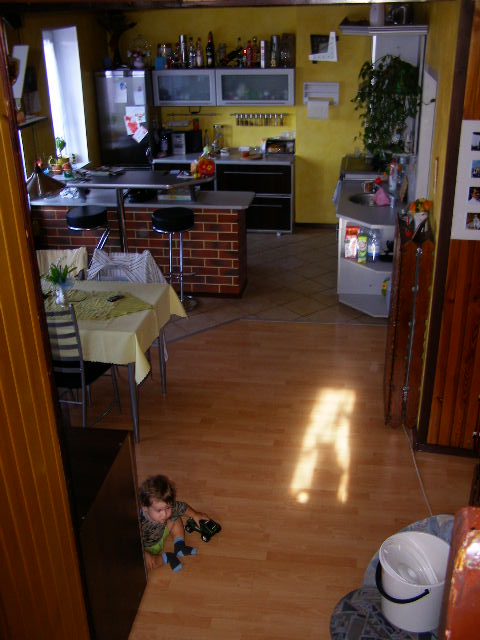 Jak stelaż był już gotowy zamówiłem płyty meblowe na obudowę – tutaj nie miałem pola do popisu – szafka musiała pasować do reszty pomieszczenia – a ponieważ fronty mebli kuchennych są w ciemnym kolorze obudowę również wykonałem w okleinie „ciemny orzechâ€. Przód szafki, tj. drzwiczki i listwy pod zawiasy zostały okute kształtownikiem C aluminium tak jak meble kuchenne w chrom macie co widać na zdjęciach (blat jeszcze przed wycięciem otworu pod przelewy komina a przy szafce moja najmłodsza pociecha):