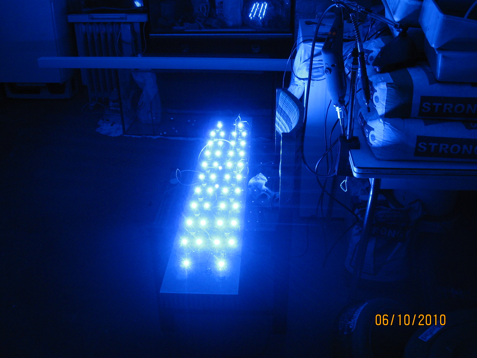 kilka fotek na małej rozdzielczości jest (narazie z prac i jak świecą same niebieskie 460 do 470 nm - 40 sztuk i dwie UV-A - te jaśniejsze punkty).