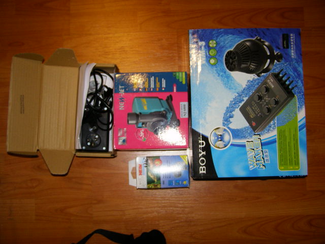 Jako obieg popracuje New Jet 6000 a jako cyrkulacja dwie maree 3200 plus wave maker Boyu WM-3 (cztery pompki 24 W plus multikontroler do tych 4 pompek – pompki są jak dla mnie mało solidne więc możliwe, że je z czasem wymienię na coś konkretniejszego – w domysle Tunze) – w sumie obieg + cyrkulacja daje jakieś 35000 l/h czyli ok. 60 razy obieg wody (planuję jakieś 600 litrów finalnie z sumpem ale netto wyjdzie na pewno trochę mniej).
