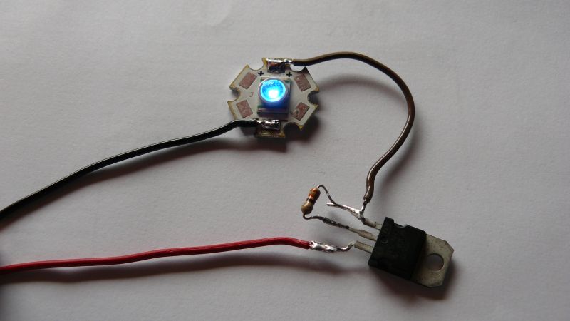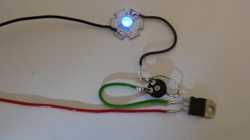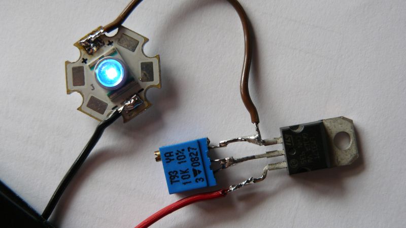 loccutus 0 Zgłoś odpowiedź Napisano 1 Sierpień 2011 Oczywiście że tak. Bierzesz LM317, jakiś dowolny potencjometr z przedziału 1k do 4.7k OHm - cokolwiek ci w ręce nie wpadnie, 5 minut lutowania i działa. Ustawiasz sobie jasność jaka cie interesuje i masz. Nawet radiatorów nie trzeba, można leda na płytce star do plastiku przykleić. Masz na szybko - ze śmieci zrobiłem przed chwilą..... prąd w obwodzie.... 0.8 mA - ledwo swieci Zasilacz - 5V 1A od starego palmtopa ładowarka (pierwszy wpadł mi w ręce, wystarczy 5V-9V / 100mA w zupełności i się dzięki temu nic nie grzeje) Potencjometr CA6 - 10k LM317 troszke przewodu dioda XR-E na płytce star schematu nie ma co wklejać - widac połączenia jak na dłoni Udostępnij tę odpowiedź Odnośnik do odpowiedzi Udostępnij na innych stronach
