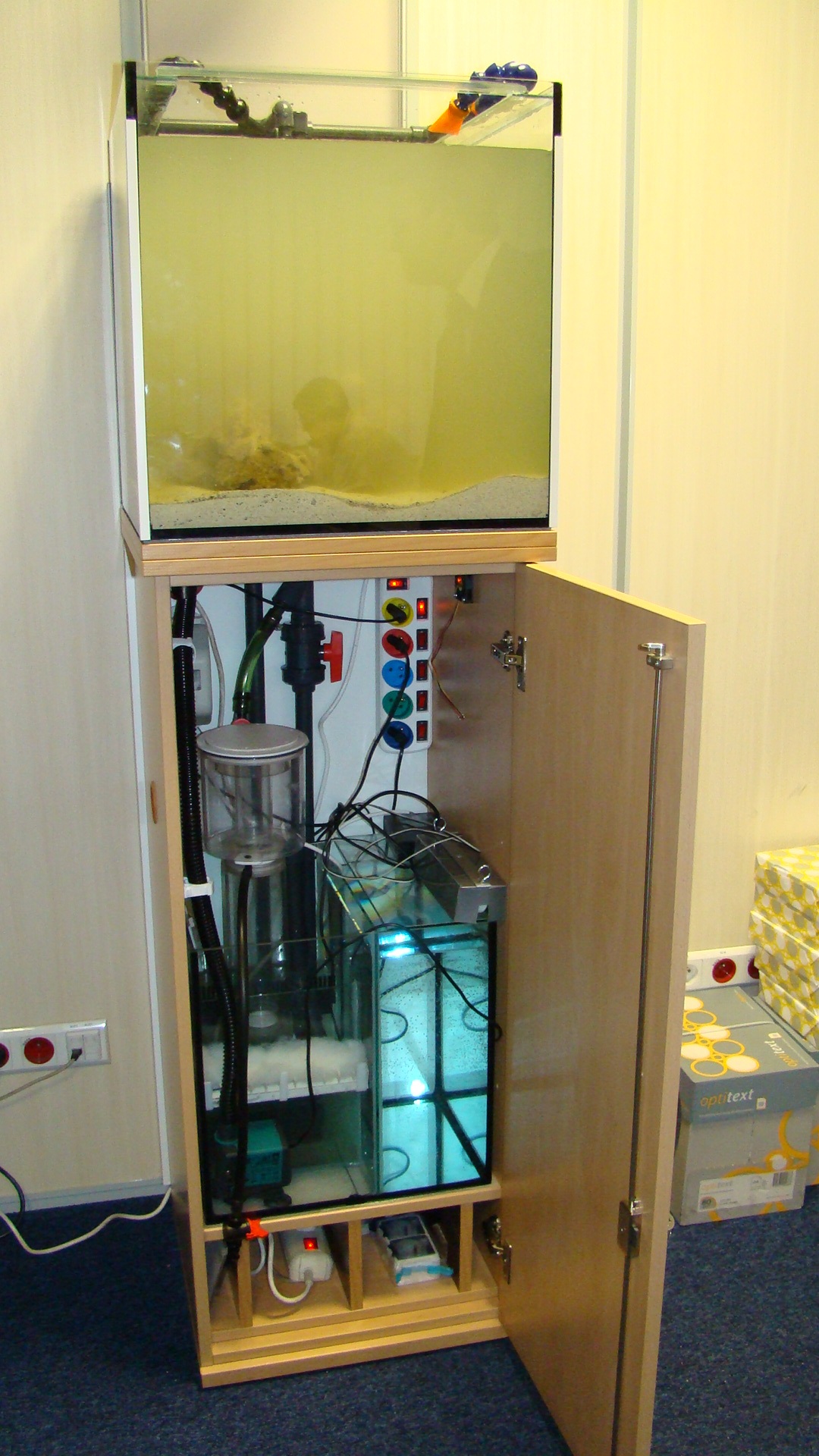 Szafka z płyty meblowej 45x45x110 cm wysoka (dzieki tak wysokiej szafce akwarium jest na wysokości wzroku i nie ma większego problemy ze zmieszczeniam sprzętu wewnątrz - niestety układanie skały po wklejeniu hydrauliki odbywało się z drabinki :() - w szafce nawiercone dwa małe wentylatorki do wentylacji na bocznych ścianach
