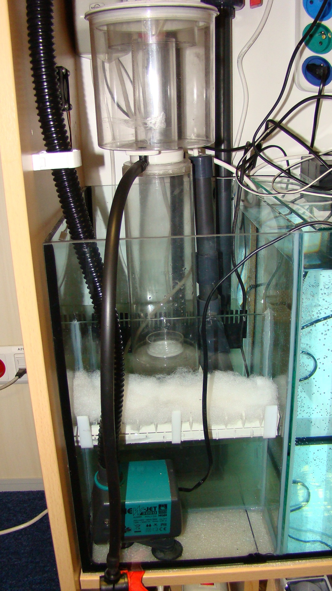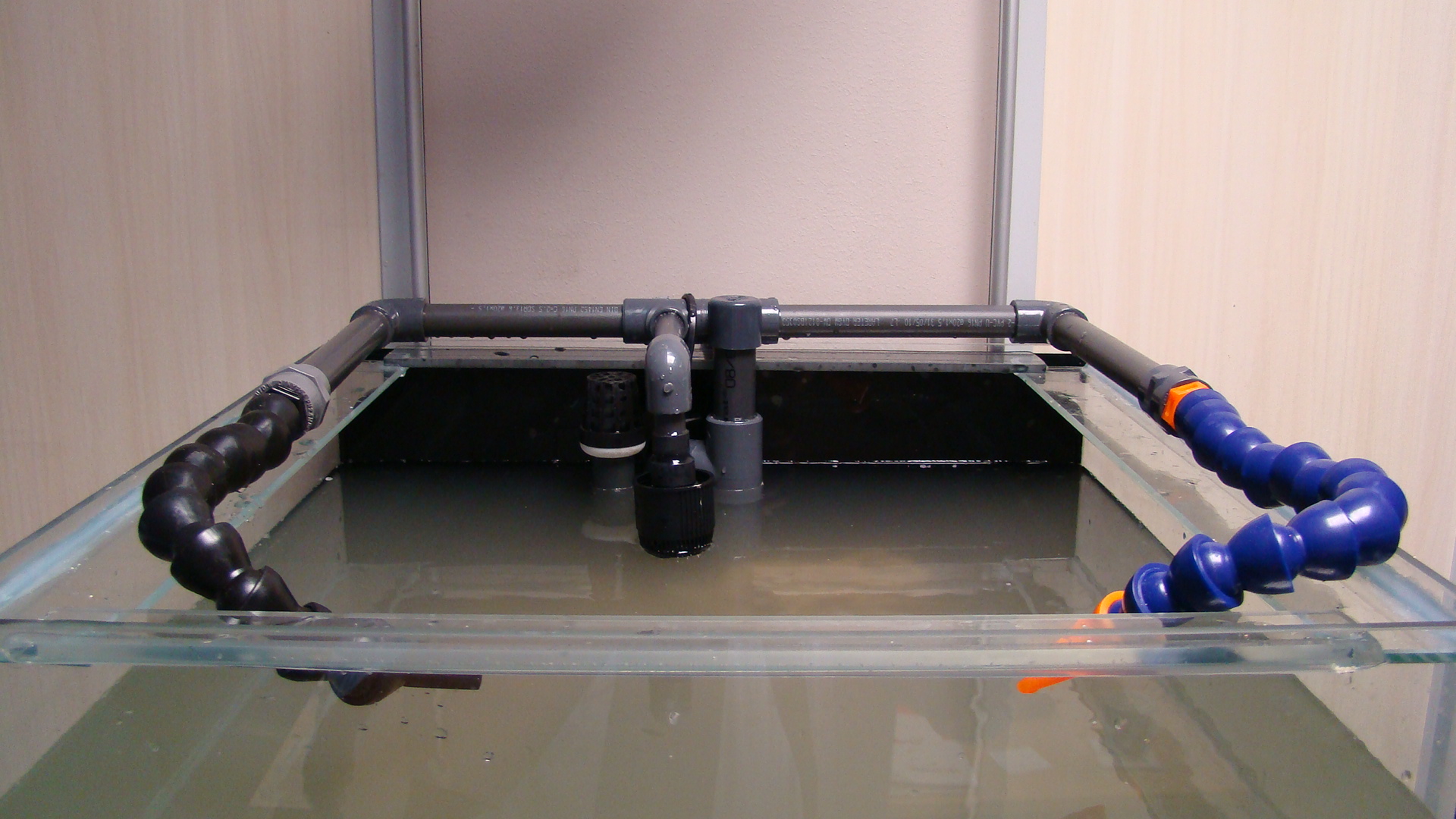 Wody w tym projekcie zlewa się troszkę, ponieważ akwarium nie ma komina tylko dwa przewody powrót z durso i ściętą rewizję - poziom daje się spokojnie wyregulować na zaworze do dolnej krawędzi rewizji. Wlot do durso i rewizji zabezpieczone koszykami o oczkach ok. 4 x 4 mm. Rewizja robi przy okazji jako skimer i łapie z powierzchni wody cały zbierający się syf :)