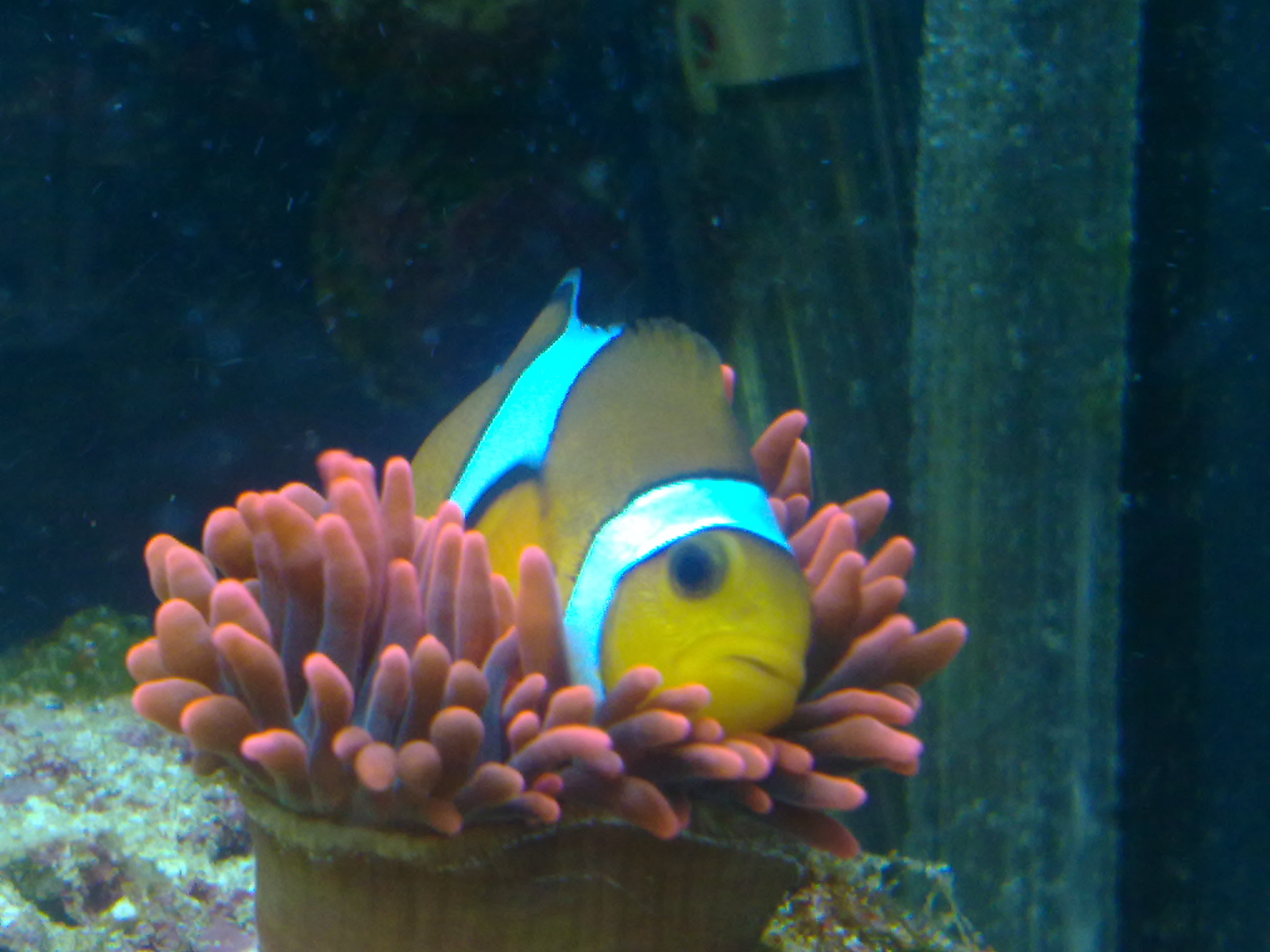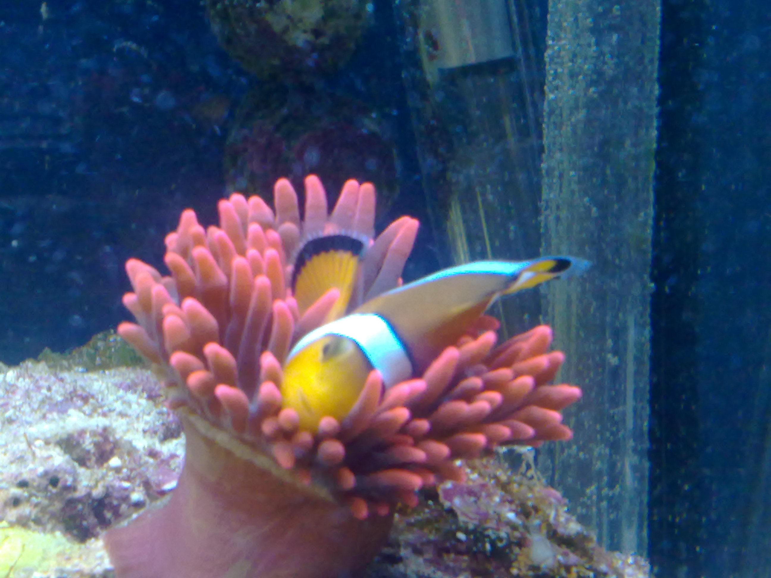 Zrobiliśmy prezent dla naszych błaznów, które ewidentnie przygotowują się do tarła i kupiliśmy im ukwiał. Ten niestety okazał się strasznym łazęgą i wędruje z miejsca na miejsce przyprawiając mnie o zawał. Błazenki zignorowały go totalnie i dalej kopią doły w piachu.