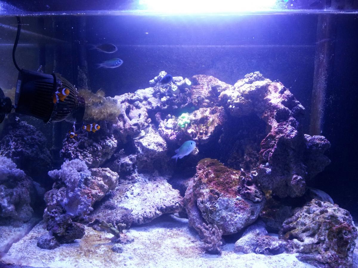 Czyli akwa świeżo po przeprowadzce. No to na pewno masz ponowne dojrzewanie. Nalałeś tam swoją stara wodę czy dodałeś nową? Dołożyłeś świeżej skały? Suchej czy żywej?....  Do wyklarowania wody pomoże dobra cyrkulacja. Ja w swojej 240 l Mam 3 pompy cyrkulacyjne. 4000 + 3.500 + 2400 wydajności (ale mam dosc dlugi zbiornik...) Co do KH. Przy wysokim KH w metodzie probiotycznej zaczyna leciec tkanka koralowcow twardych.  Co do glonow....to ja ich nie widze u ciebie. Tam nie ma glonow tylko dino lub cjano albo okrzemki (to ostatnie bardzo prawdopodobne). Dlatego to wyglada na dojrzewanie zbiornika. Jesli wszystko jest w miare ok (czyli woda, odpieniacz, cyrkulacja) to bez jakiegokolwiek dolewania czegokolwiek powinny same zniknac po jakims czasie.... 8-)